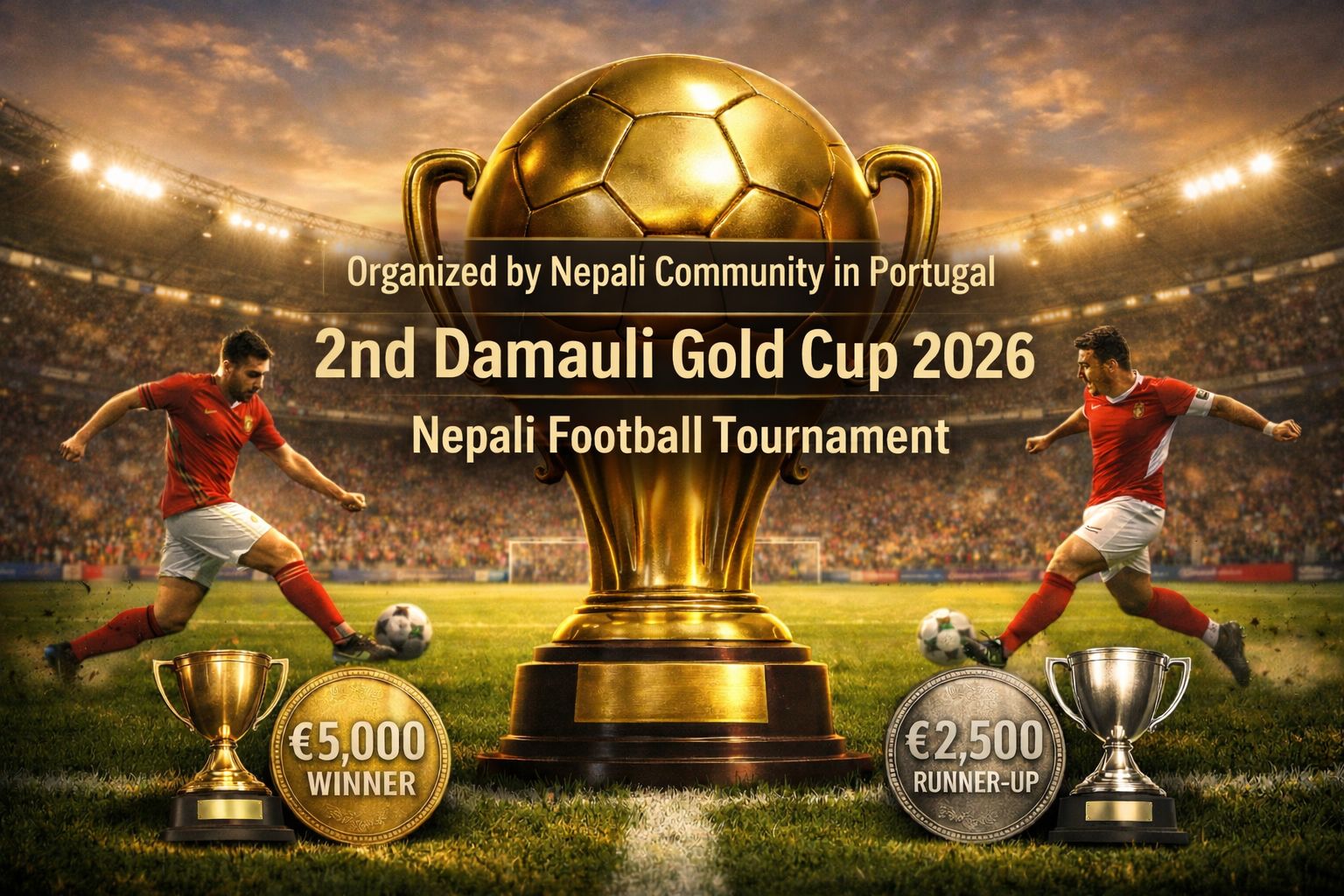पोर्चुगल – नेपाली समुदायबीच उत्साह थप्ने उद्देश्यले पोर्चुगलको लिस्बनस्थित Vittoria Clube Olais मा १४ जुन २०२६ मा ‘२औं दमौली गोल्ड कप’ फुटबल प्रतियोगिता आयोजना हुने भएको छ।